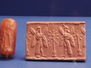 Sigillo cilindrico paleobabilonese con iscrizione in cuneiforme e raffigurazioni: al centro la cosiddetta “dea nuda” e a fianco “l’uomo-toro”