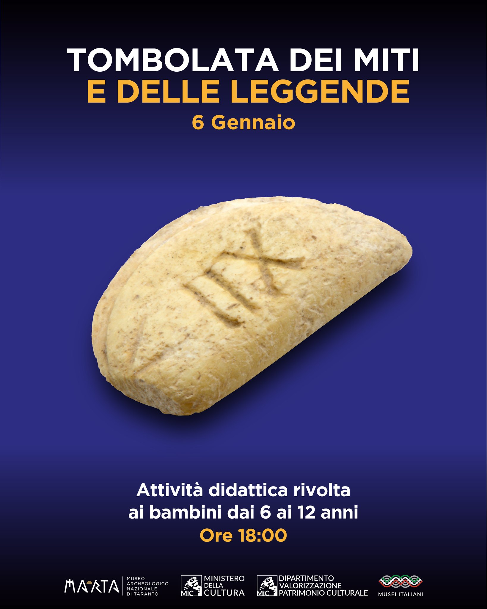 Il 6 gennaio 2026, alle 18, il museo Archeologico nazionale di Taranto invita i bambini dai 6 ai 12 anni a vivere un viaggio tra miti e leggende… giocando con la “Tombolata dei miti e delle leggende”. Tra statue, vasi antichi e reperti misteriosi, i piccoli visitatori saranno i protagonisti della Tombola Mitologica, un gioco speciale che li porterà alla scoperta di divinità, eroi e creature straordinarie custodite nelle vetrine del museo. Un’attività di circa un’ora e mezza ricca di divertimento, curiosità e piccoli premi “mitici”, con un ricordo finale per tutti i partecipanti. La partecipazione è gratuita per i bambini; per gli accompagnatori il costo è di 10 euro, salvo riduzioni o gratuità previste. La prenotazione è obbligatoria chiamando il numero 099 4532112 fino a esaurimento posti, indicando nome, cognome, email, telefono e numero dei partecipanti.