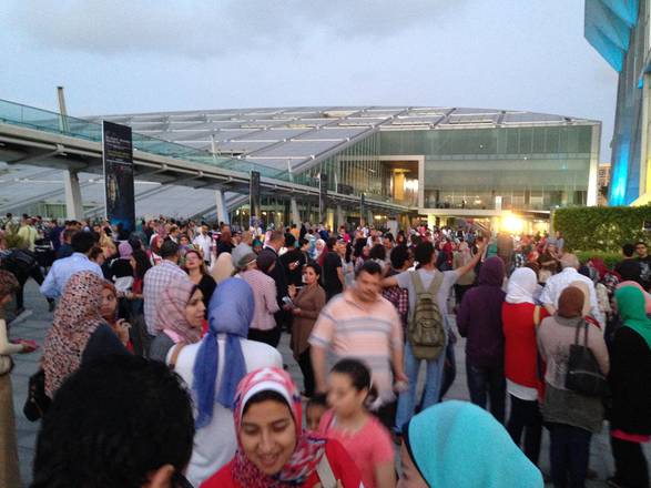 Tanto pubblico alla proiezione in 3D dei monumenti antichi di Alessandria d’Egitto su una parete della Grande Biblioteca
