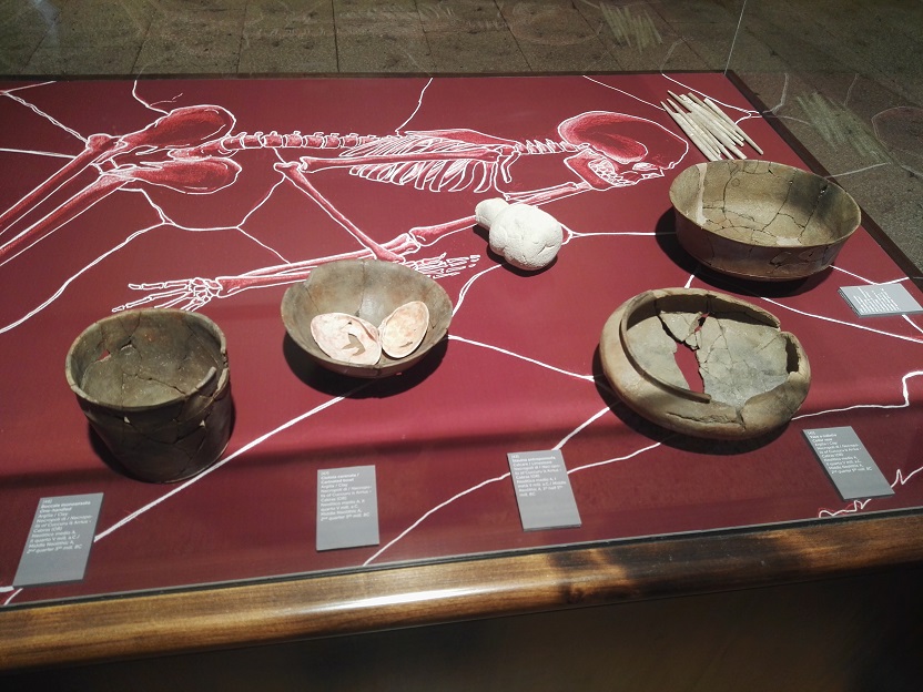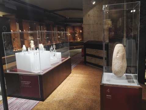Le vetrine con testimonianze del Neolitico nella mostra “Donna o dea. Le figure femminili nella preistoria e protostoria sarda” (foto Graziano Tavan)