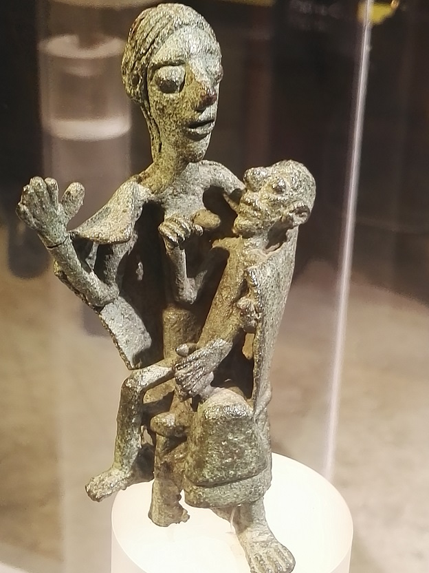Con le età del Bronzo e del Ferro, la bronzistica nuragica si esprime anche in repertori di donne calate in ruoli terreni, verosimilmente complementari a una figura maschile egemone e divinizzata. I soggetti sono spesso domestici: mogli, sorelle, madri, talvolta sorprese nel dolore del lutto. Fortemente evocativa la Madre dell’ucciso, statuetta bronzea dalla grotta di Sa Domu e S’Orku (Urzulei, Nu) che rappresenta l’incontro con il dolore di una Donna e Madre dell’età nuragica. O la Donna con infante dal complesso nuragico di Santa Vittoria (Serri, Ca). “La rappresentazione di queste madri sedute su uno sgabello circolare a cinque piedi costituisce un’iconografia di particolare rilievo”, continua Depalmas, “che potrebbe rimandare alla commemorazione di un mito o di un racconto celebrativo nell’ambito del patrimonio narrativo delle comunità nuragiche. E proprio la ricorrente associazione della figura femminile con lo sgabello, evocato nelle riproduzioni in pietra delle capanne delle riunioni, rafforza l’ipotesi che le donne sarde della prima età del Ferro potessero rivestire ruoli sociali di rilievo”.