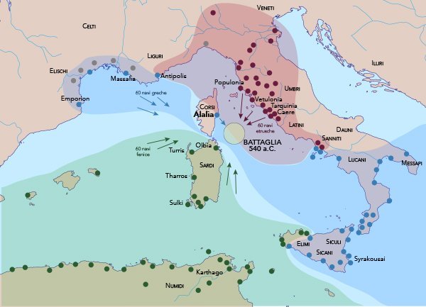 La battaglia di Alalìa. Molto attivi all’inizio del VI sec. a.C., i Focei fondano diversi emporia: prima Massalia (Marsiglia) nel 600 a.C. , poi dal 565 a.C. si stabiliscono ad Alalìa, un oppidum preesistente. Per approvvigionare i Focei, si stima fossero 15mila, servivano 10mila ettari di terreno a coltura. Con la presa della metropoli focea nel 545 a.C. da parte delle truppe persiane di Ciro, altri 500-1500 focei furono costretti all’esilio. Un piccolo numero, è vero, ma che mandò in crisi l’equilibrio raggiunto nello spazio tirrenico. Secondo Erodoto gli ultimi arrivati si alla pirateria e a incursioni “presso tutti i popoli vicini”. Di conseguenza le città marittime etrusche, preoccupate per la difesa delle loro aree di influenza diretta, organizzano con i loro alleati punici, saldamente stabiliti in Sardegna, una risposta militare che coinvolge rispettivamente 60 navi, i Focei ne oppongono altrettante 60. Così, nel 540 a.C. si svolge in mare, tra le Bocche di Bonifacio, Alalìa e Pyrgi, una delle più grandi battaglie del Mediterraneo nell’Antichità, che coinvolgerà 180 galere e oltre 14mila uomini, tutto ciò per il controllo di Alalìa.