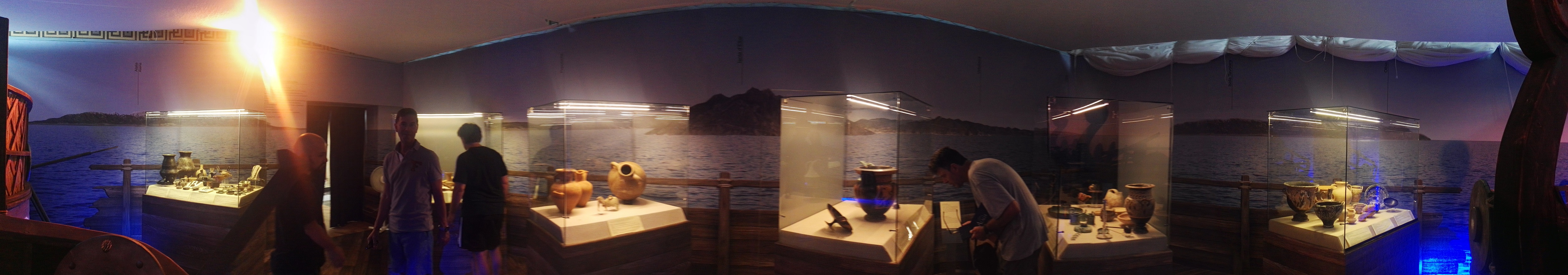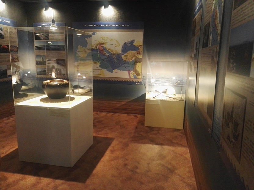 Sei vetrine come sei navi immaginarie con la stiva piena dei reperti provenienti dalle sponde del Tirreno prodotte dai popoli, che si sono scontrati nel mare Sardonio, nei secoli precedenti e successivi la battaglia navale del 540 a.C. Nelle prime tre sono esposti testimonianze dei popoli che si affacciavano sul mar Tirreno databili ai secoli precedenti la battaglia di Alalìa, cioè dalla prima Età del Ferro (IX sec. a.C.) alla metà del VI sec. a.C. Nelle altre tre vetrine possiamo conoscere i corredi dalla necropoli di Casabianda di Aleria, indagata negli anni ’60 e ’70 del secolo scorso, che ha restituito sepolture preromane con ricchi corredi posteriori alla battaglia di Alalìa.