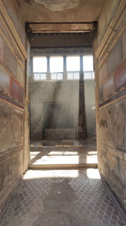 Andiamo alla scoperta della Casa Sannitica. Le abitazioni erano e sono sempre cose vive, si trasformano man mano che scorre la storia dei loro proprietari e inquilini, in un mutare continuo, che l’archeologia ci consente spesso di conoscere anche nei dettagli. Ad Ercolano, la Casa Sannitica ci racconta come è stata erosa con il passare del tempo, avendo dovuto, da un lato, cedere l’intero quartiere del peristilio ad altre due abitazioni, e, dall’altro, rendere indipendente il piano superiore con una scala esterna, evidentemente per il bisogno di darlo in affitto. Ma a ricordarci il primo splendore di questa domus, resta la raffinatezza dell’atrio con il finto loggiato di semicolonne ioniche collegate da eleganti transenne a reticolato, che, dall’alto della parete, si impone subito alla vista di chi attraversa il corridoio di ingresso.