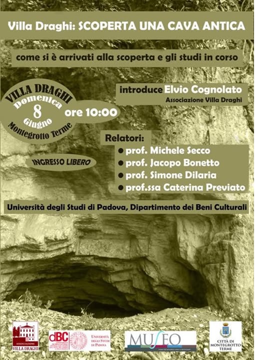 Montegrotto Terme (Pd). A Villa Draghi la conferenza “Villa Draghi: scoperta una cava antica” con i professori Michele Secco, Jacopo Bonetto, Simone Dilaria e Caterina Previato (unipd)