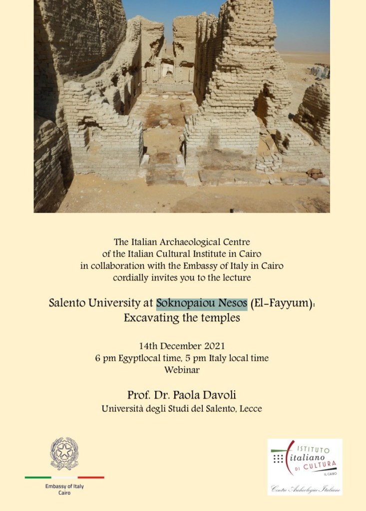 L’appuntamento è martedì 14 dicembre 2021, alle 17 ora italiana (18 ora egiziana) per il webinar “Università del Salento a Soknopaiou Nesos (El-Fayyum): scavi dei templi” a cura di Paola Davoli dell’università del Salento (Lecce), promosso dal Centro archeologico italiano dell’Istituto italiano di Cultura al Cairo in collaborazione con l’ambasciata italiana al Cairo. La conferenza potrà essere seguita attraverso Microsoft Teams al link https://teams.microsoft.com/l/meetup-join/19%3ameeting_MTI5Mzg2MzktMGE5MC00MWYxLWE2ZWYtY2Y1OWI0ZGM3ZTE0%40thread.v2/0?context=%7b%22Tid%22%3a%2234c64e9f-d27f-4edd-a1f0-1397f0c84f94%22%2c%22Oid%22%3a%22babdcf46-9524-4ae8-ae30-59e751a8a656%22%7d (istruzioni: 1- clicca sul link; 2- scegli “continua su questo browser”, non sarà necessario scaricare alcuna applicazione; 3 – fai clic su partecipa e sarai nella sala riunioni; 4- Se ti iscrivi da cellulare, dovrai installare l’app).