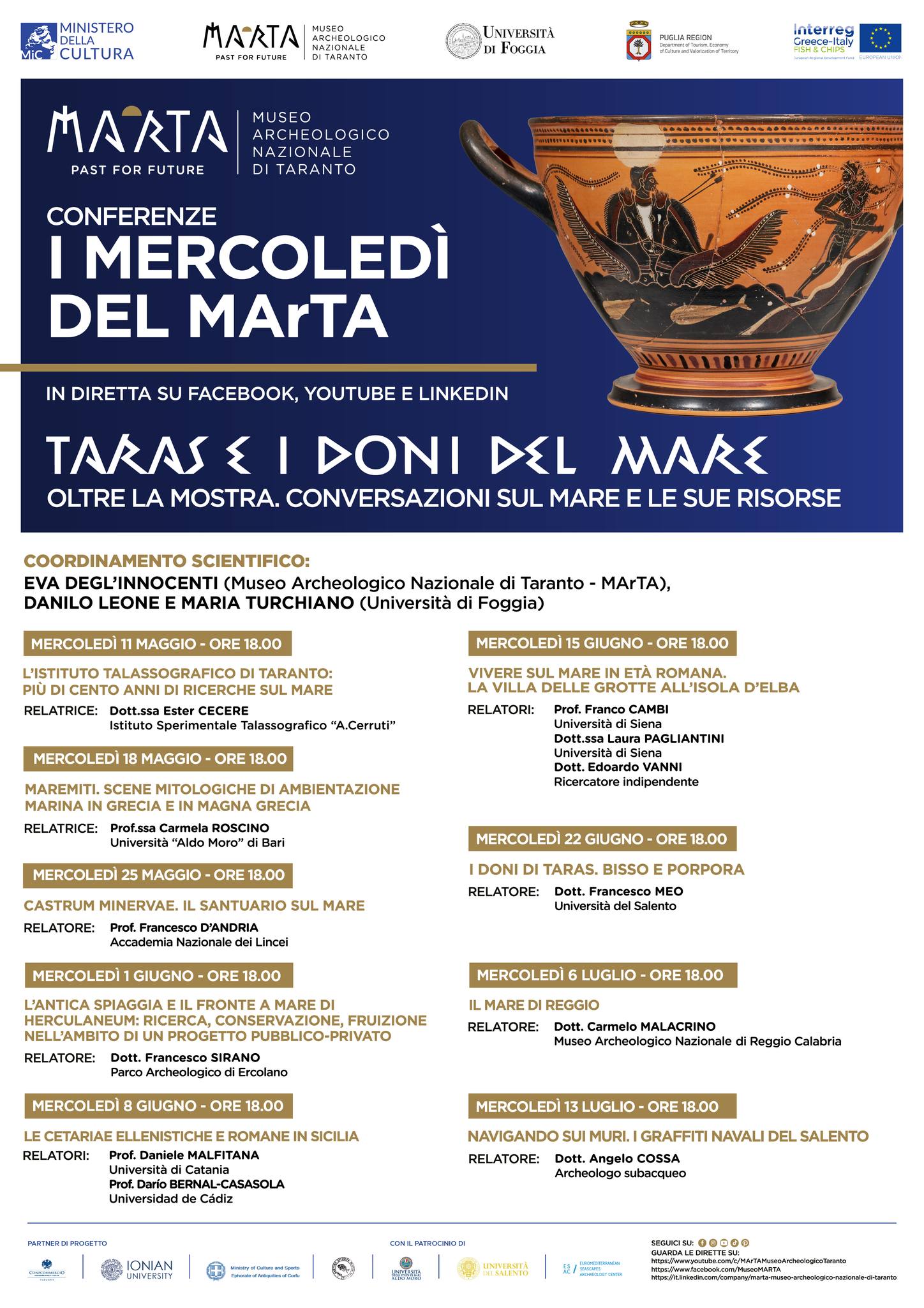 È il tempo dei Miti nel ciclo di conferenze “Taras e i doni del mare. Oltre la Mostra. Conversazioni sul mare e le sue risorse” inserito nei “Mercoledì del Marta” con il coordinamento scientifico della direttrice del museo Archeologico nazionale di Taranto, Eva Degl’Innocenti, e dei professori Danilo Leone e Maria Turchiano dell’università di Foggia. Il ciclo di incontri è offerto al pubblico dal progetto FISH&C.H.I.P.S. (Fisheries and Cultural Heritage, Identity, Participated Societies), realizzato grazie al Programma Interreg V-A Greece-Italy. Mercoledì 18 maggio 2022, alle 18, in diretta su Facebook, YouTube e Linkedin del museo Archeologico nazionale di Taranto, conferenza della prof.ssa Carmela Roscino , professore associato di Archeologia e storia dell’arte greca, Storia dell’archeologia e Iconografia e iconologia del mondo classico dell’università di Bari “Aldo Moro”, su di “MareMiti. Scene mitologiche di ambientazione marina in Grecia e in Magna Grecia”. La conversazione sarà introdotta dalla direttrice del museo Archeologico nazionale di Taranto, Eva Degl’Innocenti, e dai professori Danilo Leone e Maria Turchiano dell’Università di Foggia.