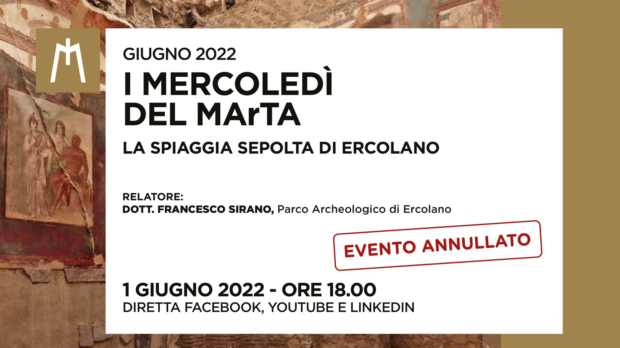 ATTENZIONE! Per sopraggiunte difficoltà, la diretta di Francesco Sirano, direttore del parco archeologico di Ercolano, su “La spiaggia sepolta di Ercolano” è rimandata a data da definirsi. L’appuntamento era previsto per oggi, mercoledì 1° giugno 2022, alle 18, con le conversazioni “Taras e i doni del mare. Oltre la mostra. Conversazioni sul mare e le sue risorse” (vedi Taranto. Per i “Mercoledì del MArTA”, nell’ambito del ciclo “Taras e i doni del mare. Oltre la Mostra. Conversazioni sul mare e le sue risorse”, appuntamento on line con Francesco Sirano, direttore del parco archeologico di Ercolano, su “La spiaggia sepolta di Ercolano”, introdotto da Eva Degl’Innocenti direttrice del museo Archeologico nazionale | archeologiavocidalpassato).