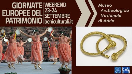 Si avvicinano le Giornate Europee del Patrimonio, quest’anno previste il 23 e 24 settembre 2017, e le istituzioni culturali si mobilitano. Il museo Archeologico nazionale di Adria, per esempio, propone per le due giornate il tema “Adria antica e i suoi tesori nascosti”. Sabato 23 settembre, alle 10.30, presentazione al pubblico del progetto di alternanza scuola-lavoro “Comunicare l’antico”, in collaborazione con il liceo classico “C. Bocchi”, la Fondazione Bocchi di Adria e la soprintendenza Archeologia Belle arti e Paesaggio per il Veneto occidentale. Nel pomeriggio, alle 16.30, esibizione di danze romane dal titolo “Terra e sole”, a cura del Gruppo Danze Antiche di Villadose. La sera: dalle 19.30 e fino alle 22.30 (ultimo ingresso alle 22.15) il museo aprirà straordinariamente al pubblico i Depositi del museo, vero scrigno di testimonianze archeologiche, al prezzo simbolico di 1 euro. Visite guidate ogni mezz’ora a cura della direzione e del personale del museo. Oltre ai depositi, sarà possibile visitare la mostra “Ornamenta. Gioielli tra storia e design”, che espone al pubblico reperti d’oro dai depositi affiancati ad oggetti di design (vedi https://archeologiavocidalpassato.wordpress.com/2017/05/18/museo-archeologico-nazionale-di-adria-per-la-festa-e-la-notte-dei-musei-speciale-percorso-archeologico-letterario-sui-gioielli-e-visite-guidate-alla-mostra-ornamenta-gioielli-tra-storia-e-d/). È consigliata la prenotazione. Domenica 24 settembre, il programma inizia alle 17 con la conferenza dell’archeologa Cinzia Tagliaferro dal titolo “Ornata Natura. I gioielli nell’antichità tra mito, rito e realtà”, con visite guidate alla mostra “Ornamenta. Gioielli tra storia e design”. Per tutto il pomeriggio, il museo accoglierà bambini e famiglie con le speciali mappe di “Scopri il tuo museo”: un modo divertente di scoprire i tesori nascosti tra le sale del museo. Ingresso gratuito alla sola conferenza.