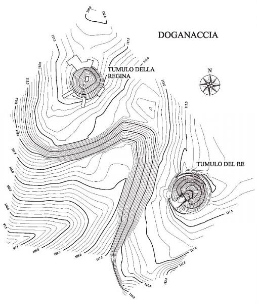 La necropoli della Doganaccia si trova al centro della vasta area sepolcrale di Tarquinia, caratterizzata dalla presenza di due grandi tumuli, che l’immaginario popolare ha chiamato “del Re” e “della Regina”, e che oggi sappiamo divisi dal passaggio (ovvero essere posti ai lati) della strada che collegava il porto di Tarquinia (non ancora localizzato con precisione) con la civita: questa strada, che oggi chiamiamo la Via dei Principi, era già stata ipotizzata dal grande etruscologo Massimo Pallottino nella prima metà del secolo scorso. “Tutta l’area della Doganaccia, come si diceva, dal tumulo del Re a quello della Regina alle tombe a essi collegati”, spiega la soprintendente, “è interessata al periodo culturale “orientalizzante” (VII sec. a.C.) che segna il trionfo della mentalità e delle forme socio-economiche della nascente aristocrazia etrusca, quella dei Principi, che avevano rapporti con Corinto, Cipro e il Mediterraneo Orientale in genere. Questo rapporto è attestato dalla metà dell’VIII secolo (730 a.C.) all’inizio del VI (580 a.C.). È in questo periodo che i Principi, come segno della acquisita potenza economica e politica, allargano i tumuli, e li riempiono di prodotti esotici, soprattutto dall’Egitto, come uova di struzzo e oggetti in faiance, che oggi possiamo ammirare al museo nazionale di Tarquinia. I Principi avevano dunque contatti e traffici regolari con i greci e i fenici”. Non conosciamo ancora l’ubicazione esatta del porto di Tarquinia, ma ci sono testimonianze archeologiche alle Saline (importante insediamento dell’Età del Ferro) e alla foce del fiume Marta. “Fonti antiche latine raccontano che verso la metà del VII secolo a.C.”, continua Russo, “qui approdò – proveniente da Corinto – Demarato, il padre di Tarquinio Prisco. Demarato arrivò a Tarquinia non a caso, ma perché già si conoscevano questi luoghi. Quindi il collegamento dalla costa alla civita, quello che passa attraverso i tumuli, era più antico e già noto”. La soprintendenza dell’Etruria meridionale ha ora lanciato il progetto di valorizzazione della Via dei Principi, sviluppando proprio i rapporti che la vicenda di Demarato sottende. Il progetto collega in un percorso culturale i tumuli del Re e della Regina con il museo archeologico nazionale di Tarquinia e le tombe etrusche dipinte.