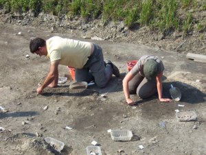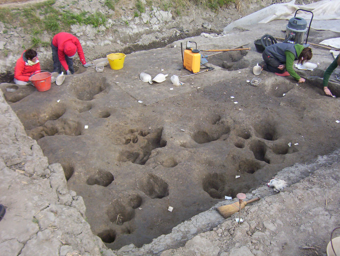 Per quanto riguarda l’area Ovest, è stato recentemente messo in luce lungo il fronte meridionale della strada un edificio di ampie dimensioni a pianta quadrangolare, suddiviso in vani, con massiccia presenza di prodotti di combustione (carbone, cenere), piccoli fornetti e alcuni drenaggi localizzati di anfore, che venivano collocati sotto i piani di calpestio con lo scopo di deumidificare e bloccare eventuali risalite dell’acqua di falda. Alcune “finestre stratigrafiche”, costituite da profonde fosse moderne che, ripulite in parete, lasciano intravedere in parete e sul fondo gli strati più antichi, sembrano mostrare la presenza di un deposito archeologico abbastanza spesso e stratificato. Come di prassi, le ricerche sul campo continueranno attraverso lo scavo manuale e la documentazione di quanto esposto, anche con l’ausilio di tecnologie avanzate come ortofotopiani, sorvoli con drone, consulenze e prelievi per analisi specialistiche. Non si segnalano, al momento, manufatti di particolare rilievo funzionale o in stato di conservazione più che frammentario, comprese le anfore utilizzate a scopo di bonifica. I reperti mobili verranno in ogni caso, come di prassi, classificati e studiati al fine di ottenere una puntuale datazione delle fasi del sito.