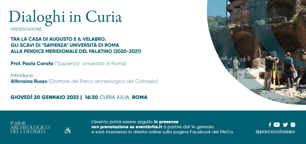 Nuovo appuntamento del ciclo “Dialoghi in Curia” in presenza e on line: giovedì 20 Gennaio 2022, in Curia Iulia, alle 16.30, la Curia Iulia ospita Paolo Carafa su “Tra la casa di Augusto e il Velabro. Gli scavi di Sapienza Università di Roma alla pendice meridionale del Palatino (2020-2021)”: presentazione dei risultati delle recenti campagne di scavo condotte da Sapienza Università di Roma nell’angolo sud-occidentale del Palatino e alle pendici del colle. L’intervento del prof. Paolo Carafa sarà l’occasione per fare il punto sullo stato della ricerca e per comunicare nuove e importanti acquisizioni derivanti dalle indagini condotte nel 2020 e nel 2021. Introduce Alfonsina Russo, direttore del parco archeologico del Colosseo. Prenotazione obbligatoria fino ad esaurimento su via eventbrite (https://www.eventbrite.it/e/231436541927). L’incontro sarà trasmesso in diretta streaming dalla Curia Iulia sulla pagina Facebook del PArCo.