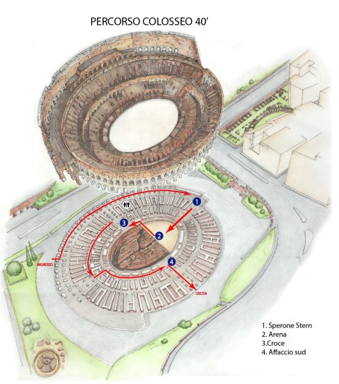 2.“Colosseo-Arena” si snoda lungo il I ordine, sempre nel segno della piena accessibilità, fino alla porta Libitinaria e da qui con un accesso emozionale sul piano dell’arena (tempo stimato 40 minuti, percorso ridotto, acquistabile con il biglietto pomeridiano- A.R.T.).