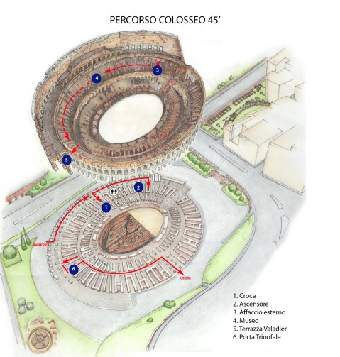 1.“Il Colosseo si racconta” prevede l’affaccio ai sotterranei dal I ordine, la salita al II ordine, la visita dell’esposizione permanente, l’affaccio dalla terrazza Valadier sulla piazza del Colosseo (tempo stimato 45 minuti). L’accessibilità sarà sempre assicurata con l’assistenza ai pubblici fragili e l’utilizzo degli ascensori con interventi sistematici di igienizzazione.