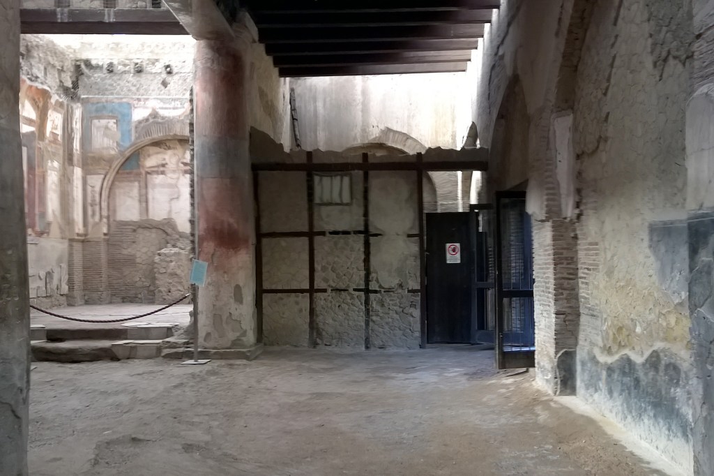 Superata la porta ci troviamo subito di fronte a quella che è stata una delle scoperte più importanti effettuata da Maiuri durante i suoi scavi: un letto, formato in parte da muratura in parte da tutta una struttura in legno, sul quale fu ritrovato il cadavere di un giovane di circa 27-28 anni, colui che si considera il custode dell’edificio. “È molto interessante che l’archeologo Maiuri abbia scelto di non completare lo scavo di questo scheletro in posizione prona, quindi faccia a terra. E probabilmente egli voleva lasciare alle future generazioni la continuazione della scoperta. Nell’ambito della revisione di tutto il materiale antropologico ritrovato a Ercolano, insieme all’università “Federico II” recentemente abbiamo effettuato alcuni lavori di pulizia. E l’antropologo Pier Paolo Petrone è riuscito a ritrovare alcune strutture cristalline, localizzate proprio nella zona del cranio dello scheletro, che sono state attribuite a materiale organico. Non solo, ma soprattutto a materiale che componeva la massa cerebrale di questo sfortunato abitante di Ercolano. Questo ha aperto un nuovo capitolo nella storia degli studi di antropologia fisica e di archeologia di Ercolano – conclude Sirano – dai quali ci attendiamo grandi novità”.