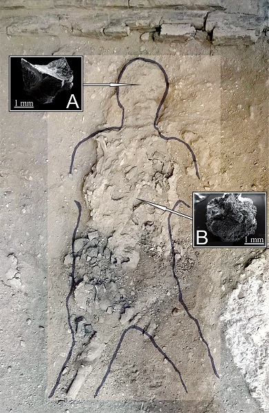 I resti del corpo carbonizzato del custode degli Augustali a Ercolano con la posizione dei resti analizzati dal team di Petrone (foto Petrone / Plos One)