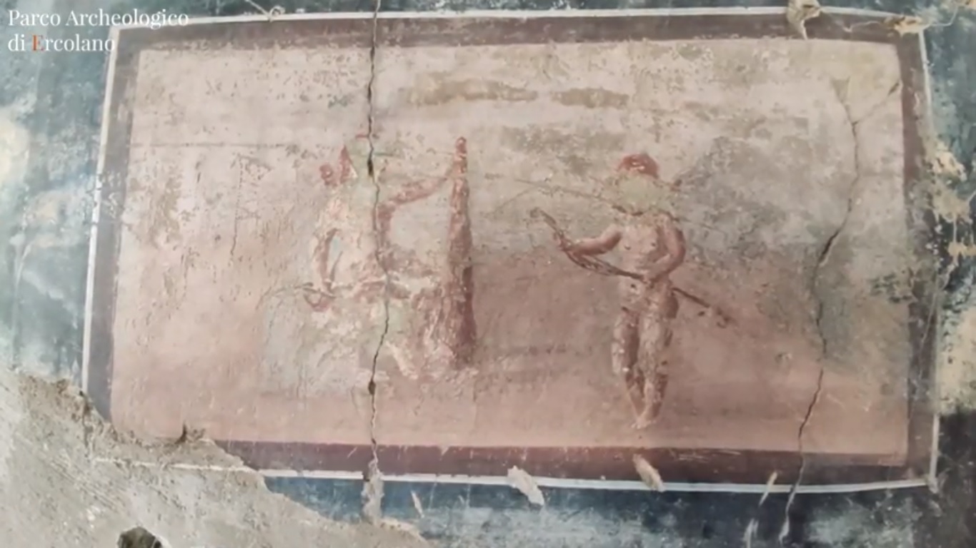 Le pitture di IV stile pompeiano raffigurano delle architetture fantastiche, candelabri, esili colonne di varia tipologia e al centro grandi quadri mitologici. Quello che si vede su una delle pareti laterali rappresenta Ercole che guarda verso Acheloo, personificazione di un fiume della Grecia, che ha rapito Deianira, la futura sposa di Ercole. “Molto interessante questa rappresentazione perché è stata messa in relazione con il posizionamento topografico di Ercolano, proprio al confine del territorio di Neapolis, la colonia greca Napoli, la quale si chiamava in un primo momento, come tutti sanno, Partenope. Partenope è una delle sirene, figlia di Acheloo. Alcuni studiosi hanno messo in relazione questa raffigurazione con un simbolismo di rivendicazione di rapporti politici, interpretabili in senso positivo e negativo con la vicina Napoli”.