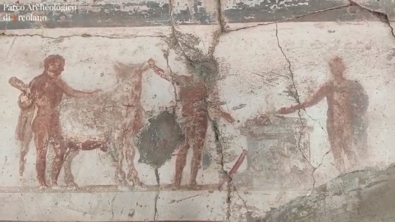 “In uno dei punti più frequentati del Decumano massimo si apriva una bottega che ci colpisce”, spiega Sirano, “perché ha delle splendide pitture di terzo stile alle pareti e sul pavimento anche le impronte di una decorazione pavimentale molto complessa, fatta tutta in lastre di marmo. Un fatto non usuale per una bottega che si spiega nel fatto che in un primo momento questo ambiente era uno dei cubicula della Casa del Peristilio tuscanico che si trova sulla sinistra cui è collegata da una porta. In una fase successiva della casa, i proprietari che gestiscono la bottega, perché c’è ancora il collegamento tra l’atrio della casa e la bottega, decidono di aprire sulla strada questo ambiente per far sì che diventi un luogo di commercio”. Le pitture si trovano al coronamento della fascia mediana della decorazione parietale. “Alcune sono mal conservate”, continua Sirano, “ma tutte hanno un senso cultuale, hanno un significato che riporta alla sfera religiosa del mondo dell’antica Roma. In particolare c’è una scena meglio conservata. Si vede un altare sul quale si sta svolgendo un sacrificio: vediamo il fumo che sale, vediamo un personaggio che sta compiendo un atto versando qualcosa sul fuoco: una libagione. Accanto all’altare una figura giovanile tiene con la mano destra le corna di un toro e con la mano sinistra sostiene una o due lance, una sicuramente. Accanto all’altare c’è, visto di profilo, un oggetto che potrebbe essere uno scudo o qualcos’altro, non credo una spada perché non vediamo le punte. Quindi sembrerebbe un’altra cosa. Chi è questo personaggio? Forse Iolaus, cioè il nipote di Ercole che lo accompagna in tante vicende. Alla sinistra della scena, c’è Ercole. Lo riconosciamo subito perché ha la clava e la pelle di leone, che sono gli elementi caratteristici. Ed è un Ercole giovane: ha i capelli ricci, e la mano sinistra appoggiata sul dorso di questo toro. Sono possibili varie interpretazione di questa scena che è chiaramente una scena di sacrificio. Secondo alcuni studiosi si tratterebbe della rievocazione della fondazione del culto di Ercole all’Ara massima a Roma, che si trovava nel Foro Boario. Quindi in questo caso ci sarebbe una somiglianza con il posizionamento vicino al Foro, vicino al posto del mercato più importante di questo ambiente della bottega dove ci troviamo. Ma un’altra possibilità sarebbe che invece qui si stia celebrando la fondazione della stessa Ercolano, e il toro potrebbe essere un ricordo di una delle fatiche di Ercole, la decima, che è quella delle mandrie di Gerione. Al ritorno dalla quale fatica Ercole si sarebbe fermato, tra tante soste che fa, proprio qui a fondare Ercolano”.