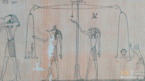 Sul Libro dei Morti famosa è la scena della Psicostasia “La pesatura dell’anima” (o del cuore), di fondamentale valenza per la religione antica egizia. “Tutte le formule magiche contenute nel libro sono finalizzate proprio a questo momento quando il defunto si trova al cospetto di Osiride”. Il defunto saluta la dea Maat, la dea della giustizia. “Al centro della scena c’è una bilancia: su un lato c’è il cuore del defunto, sull’altro la dea Maat sormontata da una piuma, perché lei è leggera come una piuma. Se il cuore sarà più leggero il defunto potrà continuare il suo viaggio verso i Campi di Iaru; se sarà più pesante lo attende una creatura mostruosa, la Grande Divoratrice, muso di coccodrillo, parte anteriore di leone, e posteriore di ippopotamo (cioè tre tra gli animali più pericolosi per gli egizi), che è pronta a mangiare il cuore, impedendo al defunto di proseguire verso l’aldilà. Il giudice supremo è Osiride”. Il giudizio tutto avviene sotto gli occhi scrupolosi di Toth, dio della scrittura, che annota tutto sulla sua tavola scrittoria, quasi con funzione di segretario verbalizzante, alla presenza di 42 divinità che costituiscono in qualche modo il tribunale, presieduto da Osiride, che valuta il comportamento del defunto. “Il Libro dei Morti serve proprio a questo: a dare le risposte giuste e opportune per quando il defunto si troverà davanti al giudizio di Osiride nell’Aldilà”.