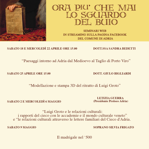 I primi due appuntamenti sono dunque sabato 18 e mercoledì 22 aprile 2020, alle 15, con Sandra Bedetti che parlerà dei “Paesaggi intorno ad Adria dal Medioevo al taglio di Porto Viro”. Si proseguirà con Giulio Bigliardi della società 3DArcheoLab che ha eseguito la riproduzione in stampa 3D del ritratto di Luigi Groto, attribuito alla bottega del Tintoretto e del frammento di ceramica attica del 440 a. C. del pittore Polignoto con il mito di Edipo, custodito al museo Archeologico nazionale. Bigliardi racconterà sabato 25 aprile 2020 alle 15 come è avvenuto il processo di modellazione 3D e scultura digitale nel seminario dal titolo “Modellazione e stampa 3D del ritratto di Luigi Groto”. Sarà poi il turno di Letizia Guerra, presidente della Proloco di Adria, che affronterà due appassionanti tematiche sabato 2 e mercoledì 6 maggio 2020, alle 15, dal titolo: “Luigi Groto e le relazioni culturali: i rapporti del Cieco con le Accademie e il mondo culturale veneto” e “Le relazioni culturali attraverso le lettere familiari del Cieco d’Adria”. Chiuderà la kermesse virtuale la soprano adriese Silvia Frigato che si esibirà sabato 9 maggio 2020 alle 15 interpretando un madrigale del ‘500 su testo di Luigi Groto, che verrà poi spiegato al pubblico.