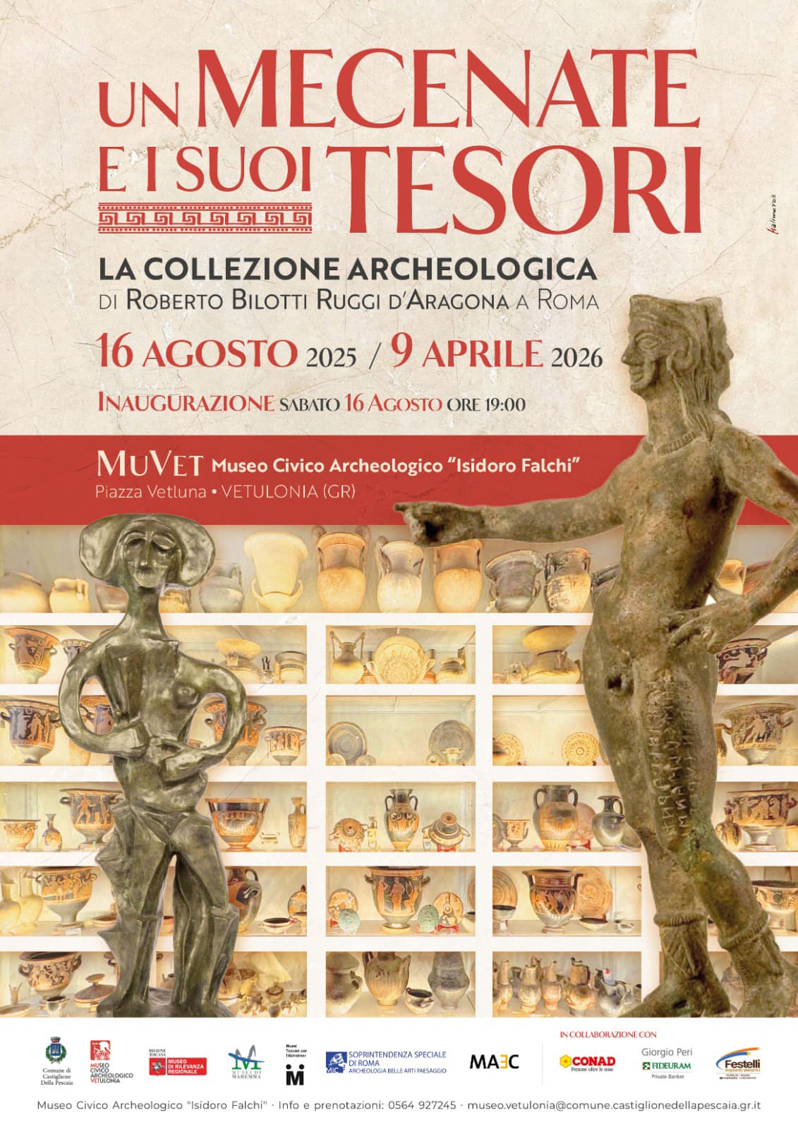 Bronzi etruschi, terrecotte votive, raffinate ceramiche di produzione etrusca, greca e magno greca, si sveleranno permettendo di ammirare un patrimonio archeologico tanto prezioso quanto sino ad oggi inedito, accompagnando i visitatori in una riflessione che, dal concetto di “Collezione” si estende a quello strettamente complementare di “Museo”, un’evoluzione, semantica e storica, dall’Antiquarium diretto discendente dalla settecentesca “Wunderkammer” o “Camera delle meraviglie”, al Museo dei nostri giorni, a matrice archeologica, ove confluiscono oggetti recuperati attraverso la ricerca scientifica, i quali ricostruiscono rigorosamente il passato dei nostri territori e dei popoli che li hanno abitati. Tutto questo è la mostra evento “Un Mecenate e i suoi Tesori. La collezione archeologica di Roberto Bilotti Ruggi d’Aragona a Roma” che si inaugura sabato 16 agosto 2025, alle 19, al museo civico Archeologico “Isidoro Falchi” di Vetulonia (Castiglione della Pescaia, Gr) con la quale celebra i 25 anni dalla nascita e la sua ininterrotta attività espositiva partita dal giugno del 2000. L’esposizione, che rimarrà aperta dal 16 agosto 2025 al 9 aprile 2026, porterà a Vetulonia una prestigiosa selezione della collezione archeologica del marchese Roberto Bilotti Ruggi d’Aragona, che per la prima volta esce dalle stanze private della sua residenza romana e si offre all’incontro con il pubblico. È il frutto di un accurato percorso di ricerca coordinato da Simona Rafanelli, direttrice scientifica del museo, e da Vincent Jolivet del Centre National de la Recherche Scientifique di Parigi. Un lavoro che ha permesso, per la prima volta, di svelare al grande pubblico reperti mai usciti finora dalle stanze private del collezionista. In continuità con i progetti espositivi del biennio 2022-2023, la Mostra 2025 si propone di abbattere ancora una volta, nell’idea e nella sua traduzione in percorso espositivo, ogni tipo di barriera spazio-temporale.