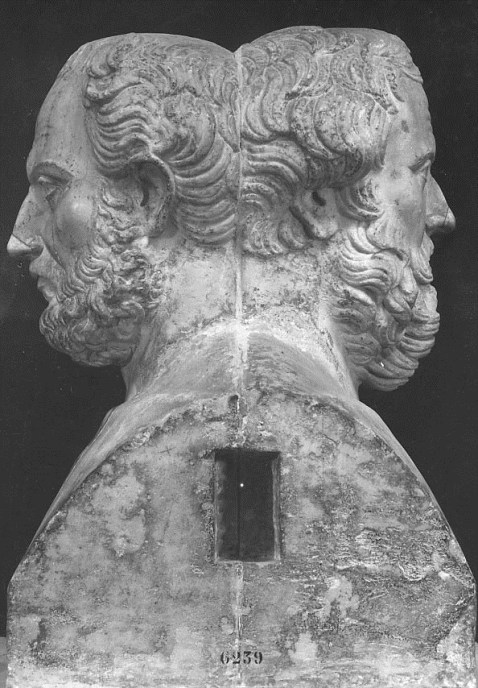 Una scelta densa di significato, dunque, per la nuova esposizione temporanea di un capolavoro del museo Archeologico alla Corte di Giustizia dell’UE: replica di modelli statuari bronzei risalenti al IV sec. a.C. , di cui è attestato un esiguo numero di copie di età romana, l’opera doveva far parte di un’antica galleria di erme bicipiti in un edificio pubblico nell’area degli Horti Maecenatis all’Esquilino. Le teste dei due storici sono legate, eppure guardano in diverse direzioni, confermando i concetti di continuità e differenza, tipici della Doppia Erma: da una parte vi è Erodoto, definito da Cicerone “il padre della storiografia”, fondatore di un metodo rigoroso di analisi dei fatti, grazie a cui sono esaminate non soltanto le ragioni degli avvenimenti, ma anche le connessioni multidisciplinari del discorso; dall’altra Tucidide, “lo storico della ragione”, lucidissimo narratore ed implacabile testimone della Guerra del Peloponneso, raccontata con rigore ed attenzione alla matrice economica del conflitto. Il pensiero di Erodoto e Tucidide è alla base della cultura occidentale ed è stato riferimento imprescindibile, per gli studiosi di qualsiasi epoca, nel dibattito sui concetti di città, democrazia, giustizia.