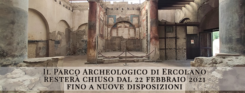 Dal 22 febbraio 2021 il parco archeologico di Ercolano resterà chiuso in ottemperanza al DPCM del 14 gennaio 2021 e all’ordinanza del Ministero della Salute del 19 febbraio 2021 che istituisce la zona arancione per la regione Campania. “Continuate a seguirci sulle nostre pagine: Web: ercolano.beniculturali.it, Facebook: https://it-it.facebook.com/parcoarcheologicodiercolano, Instagram: https://www.instagram.com/ercolanoscavi/, Youtube: https://www.youtube.com/channel/UCgpO_-ANFzlATc0CbObaQzg”.