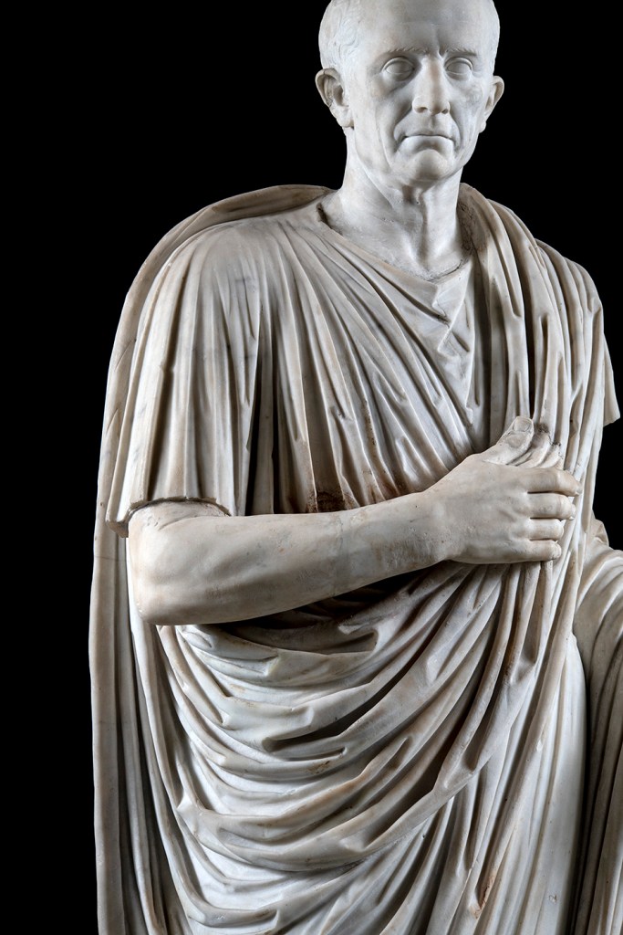 Tra i reperti da ammirare sui social anche la statua togata di Nonio Balbo (I sec. d.C.): quest’ opera, rinvenuta ad Ercolano, attualmente non è esposta, ma ha avuto collocazioni temporanee nell’Atrio e nel Portico del Cortile occidentale del Mann.