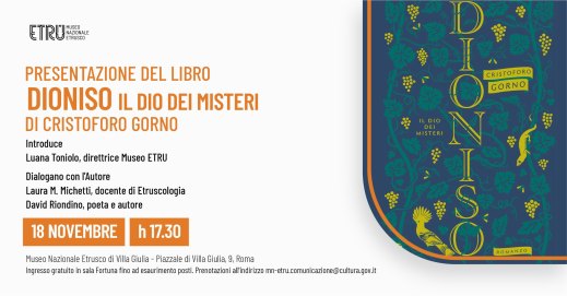 Martedì 18 novembre 2025, alle 17.30, al museo nazionale Etrusco di Villa Giulia presentazione dell’ultimo libro di Cristoforo Gorno “Dioniso. Il dio dei misteri” (Giunti editore) che racconta la grande avventura del Dio più ribelle dell’Olimpo, signore dei misteri e della follia: Dioniso. Introduce Luana Toniolo, direttrice del museo nazionale Etrusco di Villa Giulia. Dialogano con l’Autore: Laura Maria Michetti, professoressa di Etruscologia, Università La Sapienza di Roma; e David Riondino, poeta e autore. Ingresso libero in sala fortuna fino ad esaurimento posti. Prenotazioni all’indirizzo mail mn-etru.comunicazione@cultura.gov.it.