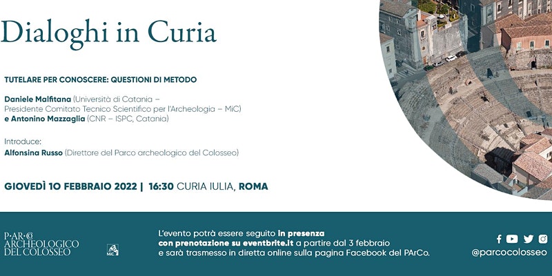 Nuovo appuntamento promosso dal parco archeologico del Colosseo per il ciclo “Dialoghi in Curia”. Giovedì 10 febbraio 2022, alle 16.30, in presenza e on line, incontro con Daniele Malfitana e Antonino Mazzaglia su “Tutelare per conoscere: questioni di metodo”, un’occasione per una riflessione sul tema della tutela dei beni culturali e sulle sue applicazioni. Introduce e modera Alfonsina Russo, direttore del parco archeologico del Colosseo. Daniele Malfitana (università di Catania – presidente Comitato Tecnico Scientifico per l’Archeologia – MiC) e Antonino Mazzaglia (CNR – ISPC, Catania) approfondiranno il ruolo specifico della tutela e di tutte le attività che permettono di riconoscere, proteggere e conservare i beni del nostro patrimonio per offrirli alla pubblica fruizione. Prenotazione obbligatoria fino ad esaurimento posti QUI. Ingresso da largo della Salara Vecchia, 5. All’ingresso del PArCo sarà richiesto di esibire, oltre all’invito, il Super Green Pass e di indossare la mascherina. L’incontro sarà trasmesso in diretta streaming dalla Curia Iulia sulla pagina Facebook del PArCo: https://www.facebook.com/parcocolosseo