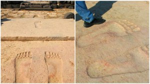 Il tempio ittita di Ain Dara, costruito intorno al 1300 a.C. e frequentato fino al 740 a.C., fu scoperto casualmente – come è successo molte volte in archeologia – nel 1955 quando fu ritrovato un leone monumentale in basalto. Gli scavi sistematici iniziarono però solo un quarto di secolo dopo, tra il 1980 e il 1985, portando alla luce un tempio a pianta rettangolare orientato verso sud-est. Nella prima fase (1300-1000 a.C.) il tempio misurava 20 metri per 30 metri, con portico, anticamera (pronaos) e camera (naos). Nella seconda fase (1000-900 a.C.) furono aggiunte lastre in basalto a foderare il portico e i passaggi tra portico e anticamera e tra questa e la camera. Nella terza fase (900-740 a.C.) fu aggiunto un ambulatorio tutto intorno al tempio, ottenuto estendendo la piattaforma su cui era stato edificato inizialmente il tempio. La facciata e le mura interne erano decorate da altorilievi raffiguranti creature mitiche, e sculture di leoni e sfingi; le grandi impronte dei piedi della dea Ishtar, la dea dell’amore alla quale probabilmente era dedicato il tempio, scolpite nel pavimento. Gli archeologi ritengono che le impronte, tre volte più grandi di un piede umano, possano aver voluto rappresentare il passaggio di una dea: “Sono uniche nell’architettura religiosa della regione”. Ora quelle impronte nell’ipotesi migliore sono ricoperte dai detriti del tempio bombardato o, peggio, distrutte con le lastre di basalto scolpite.