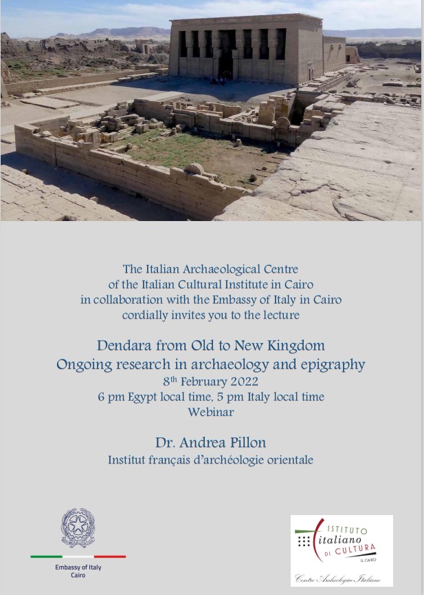 L’appuntamento è martedì 8 febbraio 2022, alle 17 ora italiana (18 ora egiziana) per il webinar “Dendara dall’Antico al Nuovo Regno. Ricerche in corso in archeologia ed epigrafia” a cura di Andrea Pillon dell’Istituto francese di Archeologia orientale (Ifao), promosso dal Centro archeologico italiano dell’Istituto italiano di Cultura al Cairo in collaborazione con l’ambasciata italiana al Cairo. La conferenza potrà essere seguita attraverso Microsoft Teams al link https://teams.microsoft.com/l/meetup-join/19%3ameeting_ZGM5N2M5NDQtMjgxZi00ZjJjLWFhN2UtNTY0Y2I5ZDE2ZDdk%40thread.v2/0?context=%7b%22Tid%22%3a%2234c64e9f-d27f-4edd-a1f0-1397f0c84f94%22%2c%22Oid%22%3a%22babdcf46-9524-4ae8-ae30-59e751a8a656%22%7d (istruzioni: 1- clicca sul link; 2- scegli “continua su questo browser”, non sarà necessario scaricare alcuna applicazione; 3 – fai clic su partecipa e sarai nella sala riunioni; 4- Se ti iscrivi da cellulare, dovrai installare l’app).