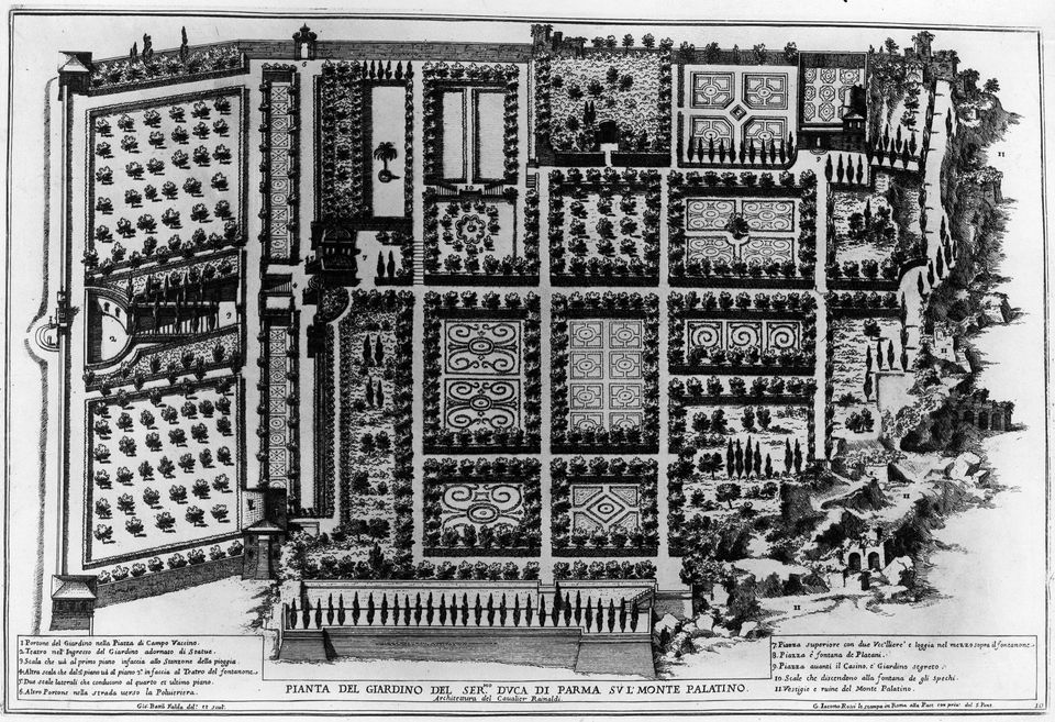 Nel Rinascimento il colle Palatino fu scelto dalla potente famiglia dei Farnese per realizzare un grande giardino privato con viali, alberi, aiuole, fontane, nuovi edifici e una collezione di opere d’arte. Il contenuto mitico e ideologico del luogo, legato alla fondazione di Roma e sede del potere imperiale, rendeva infatti il Palatino con il suo nuovo giardino uno strumento di affermazione della famiglia, che con Paolo III Farnese aveva raggiunto il soglio pontificio (1534-1549). L’Antico era elemento fondante della concezione del giardino: sul colle si potevano ammirare non solo i resti dei Palazzi imperiali ma anche le sculture della collezione privata. Umanisti e antichisti come Fulvio Orsini e Pirro Ligorio furono solo alcuni degli ispiratori del progetto. Gli Horti Farnesiani erano in realtà un luogo per la meditazione e per l’intrattenimento, destinato al tempo libero e non una vera e propria residenza. Soltanto un edificio infatti, oggi non più conservato, era attrezzato con camere, soggiorno e una cucina. Il giardino divenne così cornice di cacce, feste e banchetti, ma anche di visite all’orto botanico e alle collezioni di antichità.