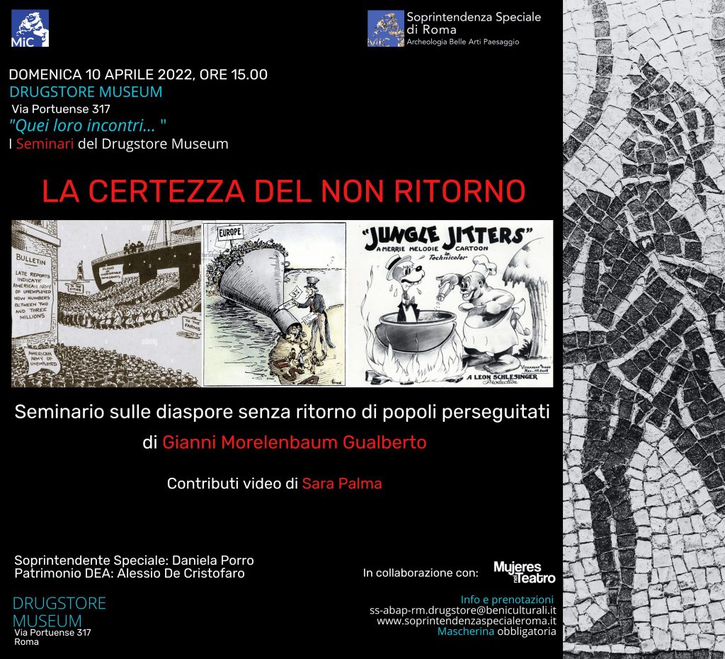 Domenica 10 aprile 2022, dalle 15 alle 18.45, “La certezza del non ritorno – le culture diasporiche”: un nuovo, importante evento al Drugstore Museum, un seminario di grande fascino sulle culture diasporiche, in particolar modo su quella ebraica e delle popolazioni africane a cura di Gianni Morelenbaum Gualberto e i contributi video con la regia di Sara Palma. L’iniziativa è promossa dalla soprintendenza speciale di Roma, diretta da Daniela Porro, con il referente dell’area Patrimonio DEA e Immateriale, Alessio De Cristofaro, in collaborazione con Mujeres nel Teatro. Il seminario “La certezza del non ritorno” analizza il tema delle culture diasporiche. “La diaspora possiede una sua irrimediabile personalità, una sua tragica grandezza rispetto alle migrazioni, alle deportazioni, alle fughe di etnie e popoli, ai nomadismi più o meno spontanei succedutisi nella storia del genere umano: in essa non vi è la possibilità del ritorno, la cui speranza è spesso tenuta in vita simbolicamente, come fattore di aggregazione resistenziale”. Come si costruisce un’identità nella dispersione? Come si preserva una unitarietà nella disgregazione? L’incontro di domenica 10 aprile 2022 a cura di Gianni Morelembaum Gualberto focalizza l’attenzione su questi aspetti isolando due casi studio: la diaspora ebraica e quella degli africani e dei loro discendenti in Europa, Asia e nelle Americhe.