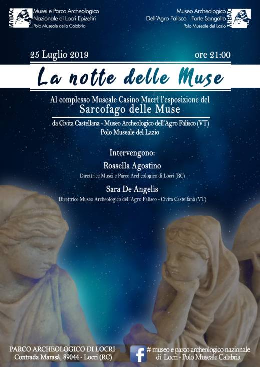 Sarà la “Notte delle Muse” per la presentazione del cosiddetto Sarcofago delle Muse che approda in Calabria nell’ambito di uno scambio di reperti tra il Polo museale della Calabria e quello del Lazio. Giovedì 25 luglio 2019, alle 21, a Locri (Reggio Calabria), al complesso museale Casino Macrì del parco archeologico nazionale di Locri sarà presentato da Sara De Angelis, direttore del museo archeologico dell’Agro Falisco-Forte Sangallo, il Sarcofago delle Muse. Artefice dell’iniziativa Rossella Agostino, direttore dei musei di Locri. Il sarcofago, di età romana, sarà esposto da luglio a settembre a Locri nell’ambito di uno scambio tra Polo museale del Lazio, diretto da Edith Gabrielli e il Polo museale della Calabria, diretto da Antonella Cucciniello che ha dato in prestito temporaneo, in occasione della mostra “Lessico italiano, volti e storie del nostro paese” allestita al Complesso del Vittoriano a Roma, la Statua del Togato, opera marmorea di valenza artistica databile tra fine I sec. a.C.- inizi I sec. d.C. La scelta di avere in prestito il sarcofago, tra le opere messe a disposizione dal Polo museale del Lazio, è legata alla volontà di ricordare al pubblico che anche nel territorio della Locride, tra le scoperte di età romana, sono stati rinvenuti due sarcofagi in marmo entrambi esposti nel parco archeologico di Locri: il sarcofago da contrada Saletta di Locri, di Caius Octavianus Crescens di II-II secolo d.C., dedicato dalla moglie al marito defunto e il sarcofago da contrada Salice di Ardore del III secolo d.C. con busto panneggiato maschile centrale e figurina di pastore accosciato alle cui spalle si vede un ariete, opera probabilmente importata da Roma su commissione. In occasione della presentazione del Sarcofago delle Muse è in programma la conversazione Rossella Agostino e Sara De Angelis, direttore del museo Archeologico dell’Agro Falisco di Civita Castellana (Vt), una bella occasione d’incontro tra due realtà archeologiche ricche e interessanti, espressioni di due diverse civiltà ugualmente affascinanti: i Falisci la cui capitale era Falerii, odierna Civita Castellana, e la cui storia è narrata dal percorso espositivo del museo di Civita Castellana e i Locresi, significativa testimonianza della cultura magno-greca.