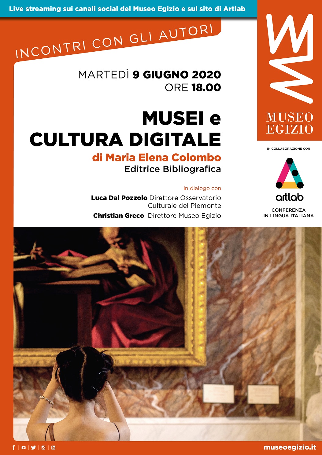 La cultura digitale ha creato le condizioni per un nuovo museo in ascolto e sempre aperto. Martedì 9 giugno 2020 alle 18, in diretta dalle sale del museo Egizio di Torino verrà trasmessa la presentazione del libro “Musei e cultura digitale” di Maria Elena Colombo. La presentazione sarà in dialogo con il direttore del museo Egizio, Christian Greco, e con Luca Dal Pozzolo, responsabile dell’area ricerca di Fondazione Fitzcarraldo e direttore dell’Osservatorio Culturale del Piemonte: un’occasione per riflettere sul senso dell’investimento nel digitale e nell’innovazione in un museo, in un momento particolare in cui tutte le istituzioni sono chiamate a reinventare il loro modo di dialogare con i pubblici. Evento in collaborazione con ArtLab e Editrice Bibliografica. La diretta sarà trasmessa sui canali social del museo Egizio (Facebook, Instagram e YouTube) e sul sito di ArtLab (https://artlab.fitzcarraldo.it/it/artlab-20/matera/appuntamento/musei-e-cultura-digitale).