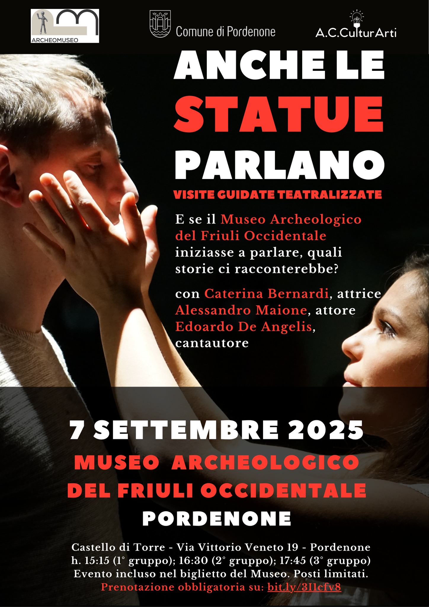 E se il museo Archeologico del Friuli Occidentale a Pordenone iniziasse a parlare, quali storie ci racconterebbe? Il progetto “Anche le statue parlano” nasce dall’idea che i Musei non vadano solo visti, ma anche ascoltati. Domenica 7 settembre 2025 gli attori Caterina Bernardi e Alessandro Maione e il cantautore Edoardo De Angelis porteranno i partecipanti alla scoperta delle affascinanti storie che il museo Archeologico del Friuli Occidentale (Castello di Torre) a Pordenone conserva. Sono previsti tre turni di visita: alle 15.15 (1° gruppo), alle 16.30 (2° gruppo), e alle 17.45 (3° gruppo). I posti per le visite guidate teatralizzate sono limitati. È necessaria la prenotazione al seguente link: bit.ly/3I1cfv8. L’evento è incluso nel biglietto di ingresso al Museo. Il progetto “Anche le statue parlano” è ideato e prodotto dall’A.C.CulturArti. L’evento è finanziato dal Comune di Pordenone. “Anche le statue parlano” nasce con l’intento di collegare passato e presente, archeologia e storia contemporanea. Si tratta di un vero e proprio viaggio all’indietro nel tempo, di tipo espressivo e artistico, un progetto innovativo di valorizzazione culturale accessibile a tutti, ideato per far conoscere e apprezzare le storie e le leggende relative alle opere conservate presso le realtà museali coinvolte nell’iniziativa. Di ritorno nel Castello di Torre dopo il tutto esaurito delle precedenti repliche, gli artisti – grazie alle suggestioni della musica e dei testi scritti per l’occasione – creeranno un dialogo tra la Storia e il Conte di Ragogna, che con la sua passione per l’Archeologia, ha dedicato la vita a raccogliere testimonianze di donne e uomini comuni vissuti migliaia di anni fa… Un viaggio nell’Antichità, ma anche un filo diretto con la Storia dei nostri giorni e un appello alla necessità di tutelare, conservare e valorizzare il patrimonio culturale.
