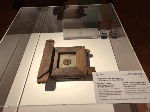 La versatilità decorativa dei lacunari fu sfruttata fin dai tempi remoti, come testimoniano i monumenti classici, dal Partenone al Pantheon. Non è un caso, infatti, che ad aprire la mostra sia un rarissimo lacunare ligneo di età romana, per la prima volta esposto al pubblico, che conserva ancora tracce di colore, scoperto recentemente a Ercolano. Il lacunare del controsoffitto a cassettoni apparteneva ad uno straordinario complesso di oggetti in legno pertinenti alla copertura di una grande sala triclinare della Casa del Rilievo di Telefo (pari a quasi un quarto dell’intera copertura). La scoperta del tetto, che conserva l’unica capriata in legno che ci è arrivata dal mondo romano, e del controsoffitto del cosiddetto Salone dei Marmi, si deve agli interventi di sistemazione dell’antica spiaggia di Ercolano nell’ambito delle attività condotte dall’Herculaneum Conservation Project, un partenariato pubblico privato avviato nel 2001 dal Packard Humanities Institute in collaborazione con l’allora soprintendenza archeologica, oggi parco archeologico di Ercolano. Questa collaborazione, giunta quasi al suo ventesimo anniversario, costituisce un unicum sullo scenario nazionale, ed ha permesso la scoperta, lo scavo, la documentazione e l’immediato consolidamento e conservazione dei preziosi manufatti lignei di una copertura crollata nel momento dell’eruzione del 79 d.C. L’insieme dei manufatti costituisce una precisa testimonianza dell’ostentazione dell’elevatissimo status sociale dei proprietari della casa, probabilmente la potente famiglia dei Nonii Balbi, di rango equestre, accreditata da rapporti diretti con la famiglia imperiale nella persona di Augusto. La sala era utilizzata come coenatio (sala da banchetto) e la decorazione del pavimento, delle pareti e del controsoffitto era basata sull’impiego di materiali rari e costosi, quali i marmi colorati provenienti da cave poste in tutto l’arco del Mediterraneo e in Africa, e sull’applicazione di competenze artigianali sofisticate e ricercate, come quelle impiegate nel pavimento in marmo realizzato con la tecnica dell’opus sectile, oppure dal tipo di assemblaggio scelto per il soffitto ligneo e dalle decorazioni intagliate e policrome dei tre piani di profondità che caratterizzano i lacunari, impreziositi al centro da lamine d’oro.