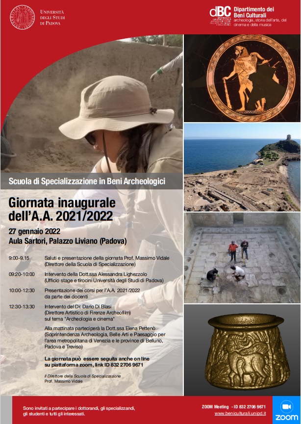 L’Anno Accademico 2021/2022 della Scuola di Specializzazione in Beni Archeologici dell’università di Padova, diretta da Massimo Vidale, nell’ambito del Dipartimento dei Beni culturali diretto da Jacopo Bonetto, apre ufficialmente con una giornata inaugurale in presenza nell’aula Sartori del Palazzo Liviano di Padova e on line (su piattaforma zoom, link ID 832 2706 9671). Appuntamento giovedì 27 gennaio 2022 al quale sono invitati a partecipare i dottorandi, gli specializzandi, gli studenti e tutti gli interessati. Si inizia alle 9, con i saluti e la presentazione della giornata da parte del prof. Massimo Vidale. Alle 9.20, intervento della dott.ssa Alessandra Lighezzolo (Ufficio stage e tirocini Università di Padova); 10, presentazione dei corsi per l’A.A. 2021/2022 da parte dei docenti; 12.30, intervento del dr. Dario Di Blasi (direttore artistico di Firenze Archeofilm) sul tema “Archeologia e cinema”. Alla mattinata parteciperà la dott.ssa Elena Pettenò (soprintendenza Archeologia, Belle Arti e Paesaggio per l’area metropolitana di Venezia e le province di Βelluno, Padova e Treviso).