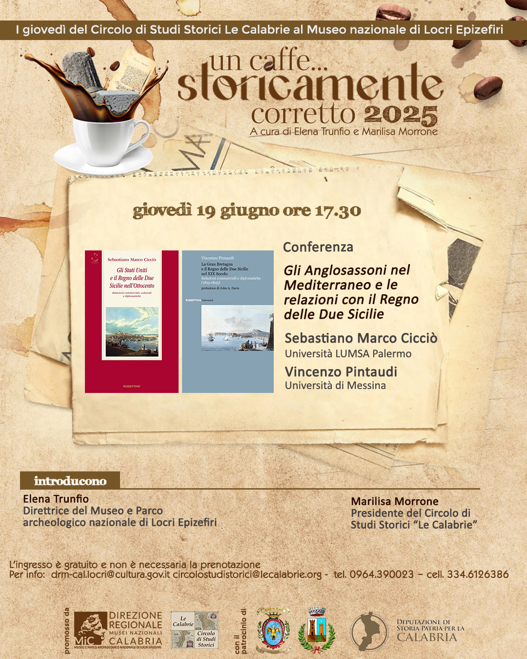Il ciclo di incontri “Un caffè…storicamente corretto” al museo Archeologico nazionale di Locri (RC) è giunto al quinto appuntamento, il secondo di giugno. Il progetto, curato dalla direttrice del museo Archeologico nazionale di Locri Epizefiri, Elena Trunfio, e dalla presidente del circolo di Studi storici “Le Calabrie”, Marilisa Morrone, oltre che con il patrocinio del Comune di Locri, quest’anno si arricchisce del patrocinio del Comune di Portigliola e della Deputazione di Storia Patria per la Calabria e vuole, come di consueto, offrire al pubblico diversi spunti di approfondimento su temi ampi legati al mondo della storia, dell’arte e dell’archeologia, con il coinvolgimento di studiosi autorevoli, afferenti tra l’altro ai più importanti atenei italiani. Giovedì 19 giugno 2025, alle 17.30, al museo Archeologico nazionale di Locri, per “Un caffè… storicamente corretto” la conferenza “Gli Anglosassoni nel Mediterraneo e le relazioni con il Regno delle Due Sicilie” con Sebastiano Marco Cicciò, università LUMSA di Palermo, e Vincenzo Pintaudi, università di Messina. Introducono Elena Trunfio e Marilisa Morrone. L’ingresso è gratuito e non è necessaria la prenotazione.