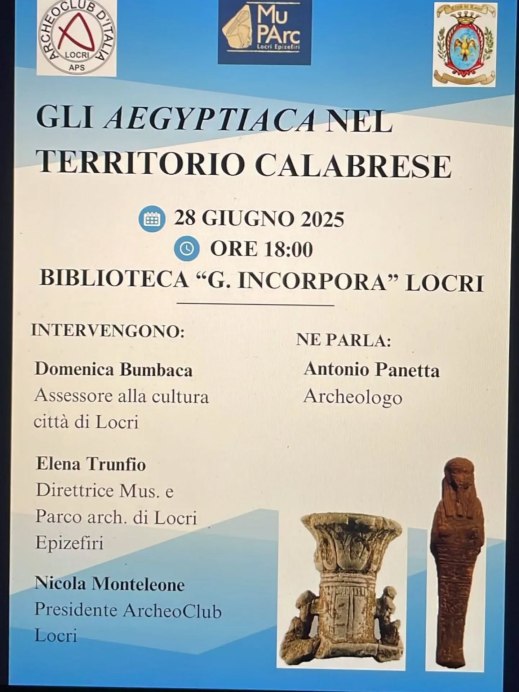 Ultimo evento di giugno al museo e parco archeologico di Locri Epizefiri. Appuntamento sabato 28 giugno 2025, alle 18, alla biblioteca “G. Incorpora” di Locri (RC), l’incontro “Gli aegyptiaca nel territorio calabrese” promosso dal museo e parco archeologico di Locri, il Comune di Locri e l’Archeoclub di Locri per parlare di un tema affascinante attraverso il Mediterraneo. Ingresso libero. Intervengono Domenico Bumbaca, assessore alla Cultura della Città di Locri; Elena Trunfio, direttrice del museo e parco archeologico di Locri; Nicola Monteleone, presidente Archeoclub di Locri. Ne parla l’archeologo Antonio Panetta.