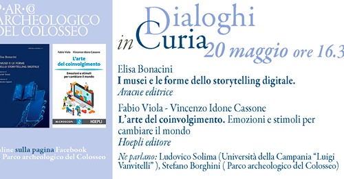 Il sesto appuntamento della rassegna “Dialoghi in Curia”, ciclo di presentazione di libri che spaziano dall’archeologia, alle figure femminili che hanno fatto la storia dell’Impero, alle nuove frontiere della comunicazione digitale dopo la pandemia, è interamente dedicato al tema dello storytelling digitale e all’arte del coinvolgimento con la presentazione di due volumi, “I musei e le forme dello storytelling digitale” di Elisa Bonacini (Aracne editrice) e “L’arte del coinvolgimento” di Fabio Viola e Vincenzo Idone Cassone (Hoepli – La Grande Libreria online), che saranno oggetto di riflessioni, alla luce anche dell’accelerazione imposta dalla pandemia che ha interessato l’ultimo anno. Appuntamento on line dalla Curia Iulia giovedì 20 maggio alle 16.30. A discutere di come si possa “coinvolgere” il pubblico nei musei e quali siano le nuove frontiere del digitale interverranno, insieme al direttore del PArCo Alfonsina Russo, Ludovico Solima (università della Campania “Luigi Vanvitelli”) e Stefano Borghini (PArCo). Per seguire la conferenza: collegarsi giovedì 20 maggio 2021, alle 16.30, all’indirizzo https://www.facebook.com/parcocolosseo; la conferenza sarà trasmessa nel primo post disponibile sulla pagina (non è necessario avere un account Facebook) e sarà disponibile anche sul canale YouTube; dopo il 22 maggio il video sarà disponibile qui: https://parcocolosseo.it/evento/dialoghi-in-curia-lo-storytelling-digitale-e-larte-del-coinvolgimento/; dopo il 22 Maggio l’audio sarà disponibile qui: https://open.spotify.com/show/3JU094BAQp4eITYs6iAsRC.