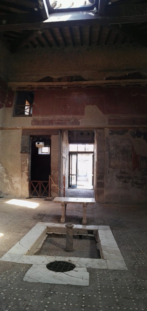 Una volta passati dalla terrazza sull’avancorpo, che guardava panoramicamente al mare, alla terrazza mediana, si trovano altri ambienti sia con l’affaccio verso il mare, sia più all’interno. Tutti ambienti sontuosi, comunque molto grandi: avevano pavimenti in marmo ancora una volta strappati durante i lavori di restauro precedente all’eruzione del 79 d.C. E una grande apertura verso il salone principale della casa. Subito di lato al salone un cortile era un pozzo di luce utilizzato sia dagli ambienti interni – grazie a una finestra – sia dal salone, dove pure si vede l’imposta di un grande finestrone. E vi si affacciava anche un oecus, un ambiente di soggiorno di cui vediamo una finestra che pure prendeva luce e aria dal cortile. Sul lato Nord del cortile una vasca con al centro lo zampillo d’acqua che fu utilizzato dal momento in cui anche questa casa poté essere allacciata all’acquedotto. In un primo momento infatti fu utilizzata l’acqua che veniva raccolta e che le coperture durante la pioggia restituivano”.