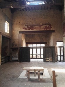 “Il tramezzo di legno è una delle scoperte eccezionali ed è unica in tutto il mondo romano. Una parete di legno a soffietto fissa. Questa è composta da un’intelaiatura e presentava tre porte: due di dimensioni minori e una centrale più grande. Le decorazioni secondarie erano composte da borchie di bronzo. E molto interessante qui la copia in gesso di alcune prue di navi che erano in bronzo e che servivano per appendere le lampade. Questo ricorda l’uso che viene ricordato anche da Petronio a proposito della casa di Trimalcione nella vicina Pozzuoli. L’intero atrio è decorato con delle pitture del cosiddetto quarto stile, pitture scenografiche che evocano l’ambiente del teatro e anche in alcune immagini che evocano delle maschere. L’articolazione della parete di legno in tre porte di una centrale maggiore ricorda quella di un frontescena di un teatro. Le due valvae hospitales da cui entravano i personaggi minori del teatro e quella centrale attraverso la quale passava il protagonista. È probabile che anche qui ci fosse una voluta reminiscenza del teatro. Il padrone di casa, attraversando questa porta, andava incontro ai suoi clientes e, come un deus ex machina, risolveva i problemi di tutti. Di che cosa si parlava al di là di questa parete? A cosa serviva una parete che non impediva il passaggio della voce perché l’altezza è limitata. Probabilmente serviva a far trattare in maniera riservata degli affari che prevedevano firme e scritture, queste sì impedite alla vista dalla chiusura delle porte. Al di là del tablino si trovava il giardino sul quale si apriva una serie di ambienti di rappresentanza e anche alcuni ambienti ai piani superiori. La casa viene dotata infatti di due appartamenti che saranno dati in affitto nell’ultima fase”.
