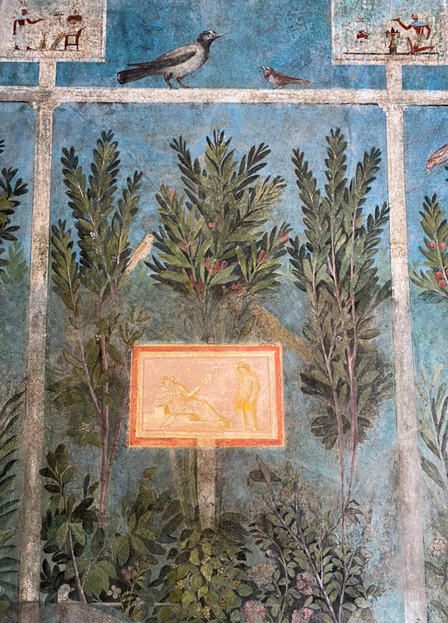 Un giardino luminoso della Casa del Frutteto a Pompei, immaginato di giorno nel pieno rigoglio del verde, con una precisione di dettagli tale da rendere possibile il riconoscimento delle specie vegetali (foto parco archeologico di Pompei)