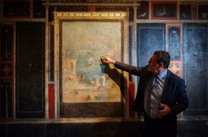 Il direttore generale del parco archeologico di Pompei, Massimo Osanna, mostra gli affreschi della Casa del Frutteto (foto parco archeologico di Pompei)
