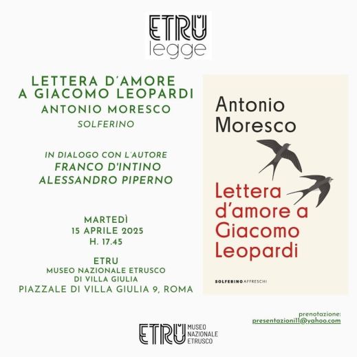 Per il ciclo ETRUlegge, martedì 15 aprile 2025, alle 17.45, al museo nazionale Etrusco di Villa Giulia presentazione del libro “Lettera d’amore a Giacomo Leopardi” di Antonio Moresco. L’Autore dialogherà con Franco D’Intino e Alessandro Piperno. Ingresso gratuito in sala fortuna fino ad esaurimento posti. Prenotazione consigliata all’indirizzo mail: presentazioni11@yahoo.com. Attività a cura dell’Associazione Amici dell’Arte moderna a Valle Giulia. Viviamo tempi folli e terribili: anni di guerre, di deliri identitari, di odio e fobie. Quale momento migliore per una lettera d’amore? E non una qualsiasi: una lettera a Giacomo Leopardi, il poeta che più di ogni altro ha raccontato i tormenti del suo presente e la difficoltà di trovare un proprio posto nel mondo, aprendo al contempo spazi di sovrumani silenzi e profondissima quiete dove portare in salvo i suoi lettori, almeno per un attimo. Incontrato in anni formativi difficili, Leopardi è diventato per Antonio Moresco il compagno di viaggio di tutta una vita, e allo stesso modo può esserlo per noi: un amico che non ci tradisce, che non ci abbandona, che sa farci sognare ma anche colpirci con la verità. Moresco compone così il più vivo, lirico e universale dei libri su Leopardi: racconta una giovinezza macerata di dubbi e illuminata di illusioni; ne attraversa il pensiero e l’opera ragionando su cosa sia – e cosa non dovrebbe essere – la letteratura; riscopre assieme a lui l’amore e la ribellione, la libertà e la morte; indaga sull’incombenza del male e sulla tentazione della felicità. Infine, con lui si libra in volo, alto sulle miserie del mondo, per raccontare il nostro presente come lo avrebbe visto e interpretato Leopardi e per regalarci, sul tempo in cui viviamo, un punto di vista nuovo: quello delle rondini, quello dei poeti.