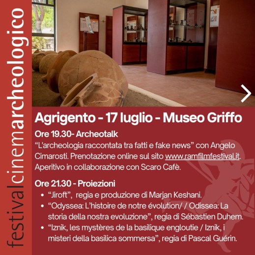 17 luglio – Museo Archeologico Regionale “Pietro Griffo”: alle 19.30, Archeotalk “L’archeologia raccontata tra fatti e fake news” con Angelo Cimarosti, direttore del portale Archaeoreporter. Partecipazione gratuita con prenotazione online sul sito www.ramfilmfestival.it. Aperitivo in collaborazione Scaro. Alle 21.30, apre il film “Jiroft” di Marjan Keshani; segue il film “Odyssea: L’histoire de notre évolution / Odissea: La storia della nostra evoluzione” di Sébastien Duhem; chiude il film “Iznik, les mystères de la basilique engloutie / Iznik, i misteri della basilica sommersa” di Pascal Guérin.