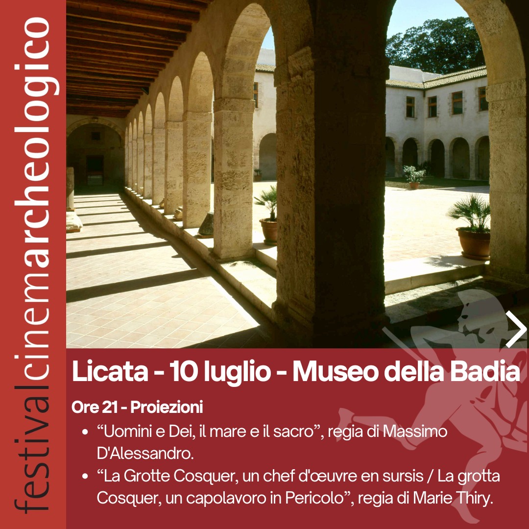 LICATA, 10 luglio – Museo Archeologico Regionale della Badia: alle 21, apre il film “Uomini e Dei, il mare e il sacro”, regia di Massimo D’Alessandro; segue il film “La Grotte Cosquer, un chef d’œuvre en sursis / La grotta Cosquer, un capolavoro in Pericolo”, regia di Marie Thiry.
