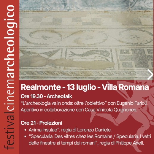 13 luglio – Villa Romana di Durrueli: alle 19.30, Archeotalk “L’archeologia va in onda: oltre l’obiettivo” con Eugenio Farioli Vecchioli, autore, regista e filmmaker di Rai Cultura, capo-progetto della serie “Italia. Viaggio nella bellezza”. Partecipazione gratuita con prenotazione online sul sito www.ramfilmfestival.it. Aperitivo in collaborazione con Casa Vinicola Quignones. Alle 21, apre il film “Anima Insulae” di Lorenzo Daniele; segue il film “Specularia. Des vitres chez les Romains / Specularia. I vetri delle finestre ai tempi dei romani” di Philippe Axell.